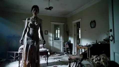 Kling 1.5 (pro) Prompt: The camera pans across a dimly lit room in a dilapidated house, revealing a zombie woman with glowing blue eyes standing motionless in the corner; she wears a torn wedding dress, and her body is partially obscured by shadows. The camera slowly circles her, revealing details of her decaying flesh and the intricate patterns of cracks on her skin. The room is filled with debris and broken furniture, adding to the sense of decay and neglect. The lighting is primarily from a flickering candle, casting long, dancing shadows on the walls. As the camera completes the circle, a sudden gust of wind blows through the room, causing her tattered dress to momentarily flutter.
