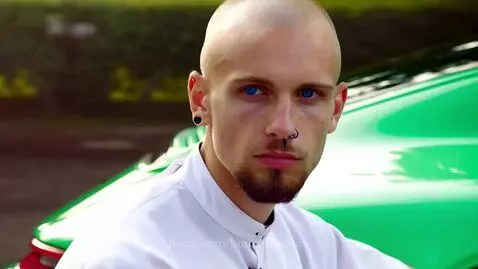 MiniMax Director Prompt: დავითი 25 წლისაა, 180 სანტიმეტრი სიმაღლის და70ლოგრამი, ფერის ფერის კიტუში და სხეულიზე ტატ და თმა არააქვს. თავი გადაპარსული აქვს და წვერი გაპარსული. ახლა თეთრი პერანგი აცვია და მწვანე ფერის პორშე 911 საჭესთან ზის და ჩქარა მიდის