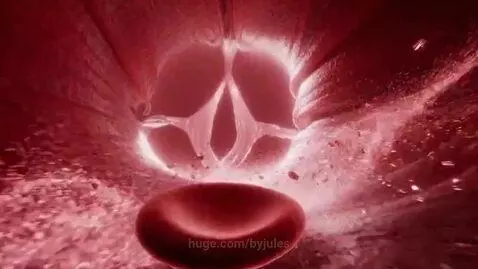 AI Prompt: Subject: Scientific 3D visualization, wide shot from the POV of a red blood cell entering a massive, cavernous heart chamber (atrium). Action: The cell is propelled into a vast open space by a powerful jet of plasma. In the center, a gigantic, translucent mitral valve structure opens rhythmically like a massive biological gate. Physics: Intense turbulent fluid dynamics, swirling particles, the cell spins gently in the current. Lighting: Dramatic volumetric lighting shafts piercing through the chamber walls, illuminating the valve in a translucent white and red palette. Style: High-end medical CGI, cinematic scale, 8k resolution, serene but powerful atmosphere. Audio: Loud, resonant, deep mechanical thumping of the heartbeat, rushing water sound with echo.