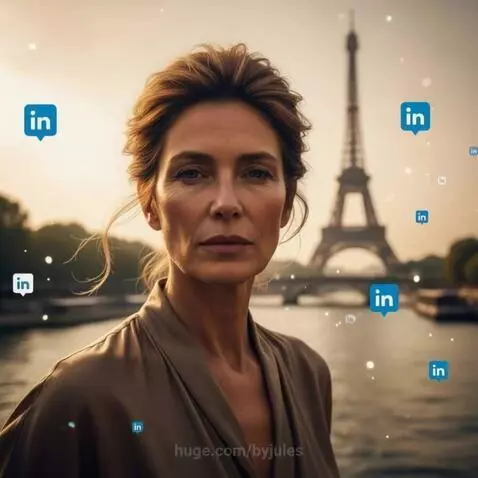 Subtle emotional evolution on fashion muse portrait: start with intense charismatic direct gaze half-closed eyes artistic focus; smooth 3s transition to confident mischievous smile lips subtly pinching then stretching joyfully; micro-breathing textured skin vibrates with creative passion; background Seine golden hour Eiffel Tower mist pulses lightly, LinkedIn lights rhythmically sparkle; slow camera dolly in on face, high quality cinematic smooth minimal motion blur, loopable 8s –c 5 –m 2” (see the generated image above)