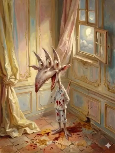 This freak in bloody PJs spins like mad… then bolts to the window! What’s he up to under the moon?” (Raspy, playful kid voice with echo)