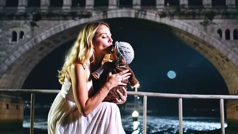 [Low angle] Stone arch bridge over dark river in deserted city center. Full moon reflects on water. A blonde woman (ethereal, white summer dress) leans on railing.