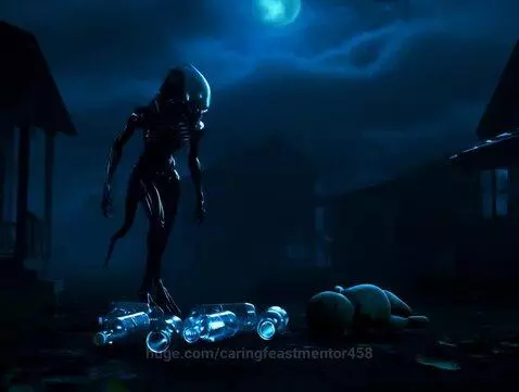Wan-2.1 Prompt: Photorealistic, cinematic shot in a surreal horror style, depicting a Xenomorph, an alien creature with glossy black biomechanical skin, elongated skull, sharp limbs, and a long tail. The creature moves slowly and purposefully along an abandoned, dimly lit village street deep at night. Dilapidated wooden houses and broken windows create a dark, ominous background, with strange, pulsating bioluminescent fungi emitting a faint, unnatural glow on some house walls, and thin, glowing tentacles slowly writhing out from beneath the ground. Fallen leaves, dirt, and household debris are scattered around, along with several old, worn-out children's toys that seem to move slightly on their own. The Xenomorph stops, then bends down, using its long, thin fingers to carefully pick up empty glass bottles and an old wooden doll, one of whose eyes unexpectedly opens, emitting a barely audible, fragile clinking sound, and meticulously arranges them into strange, geometric patterns on the ground, from which a faint, pulsating light emanates, as if performing a ritual. A slow, unsettling low-angle tracking shot, captured with a wide-angle lens and a slight fisheye effect, emphasizes the creature's massiveness and menacing presence, while the camera smoothly pans, occasionally tilting slightly (Dutch angle) to create a sense of discomfort, following its movement. The scene is illuminated by sparse, cold moonlight piercing through dense clouds, creating deep shadows and a dominant blue-green color palette. Thick fog creeps along the ground. Barely visible distortions shimmer in the sky, as if reality itself is trembling. Audio: a low, almost inaudible mechanical hum, blending with wind sounds, clinking bottles, and faintly discernible, distorted whispers drifting from afar, occasionally resembling child's babbling.