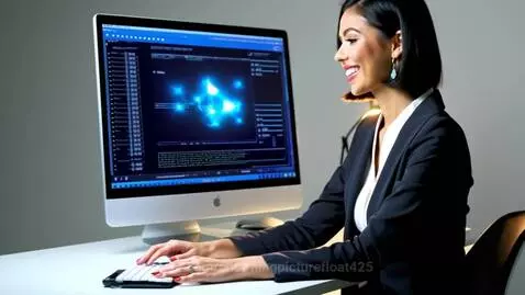 Общий план: женщина продолжает работать, вокруг неё в воздухе парят иконки её услуг: