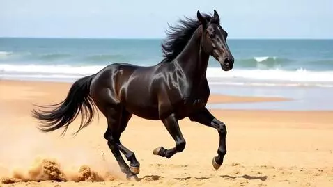 Black Andalusian Stallion Gallops on Beach
