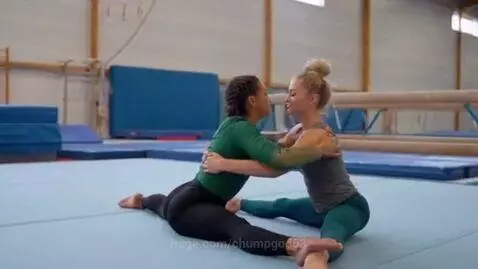 two gymnasts sit opposite to each other, their legs nearly in a side splits. they hug each other and pull each other closely so that their legs do a perfect side splits in a straight line