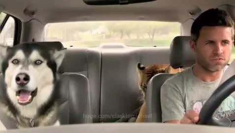 Car driving a car while husky screaming in the front seat while a lion and tiger in the back seat
