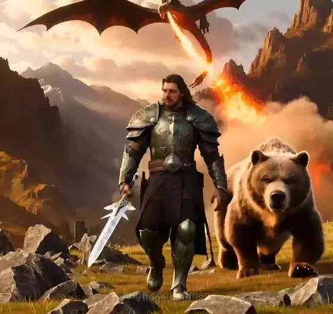 Kling 2.5 Turbo (pro) Prompt: Рыцарь Кислевит из мира Warhammer Fantasy с ледяным клинком в руках и его грозный боевой медведь идут рядом, пока дракон улетает на фоне гор. Воин с медведем занимают боевую стойку, готовясь к битве, а медведь зевает, показывая зубы. В горах на заднем плане появляется темно-зелёный орк с двумя топорами, который грозно трясет ими. Камера смещается, меняя ракурс, но удерживает фокус на героях и орке.