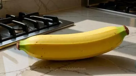 A banana becomes a chrome spring and becomes sprung into a peeled and sliced banana acai bowl