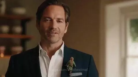 Man with dark hair and rugged nose wearing a suit talking about the importance of cooking with real butter while miniature elf in a green tunic climbs the front of his suit unnoticed