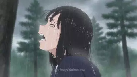 Cartoon girl crying in the rain with forest in background