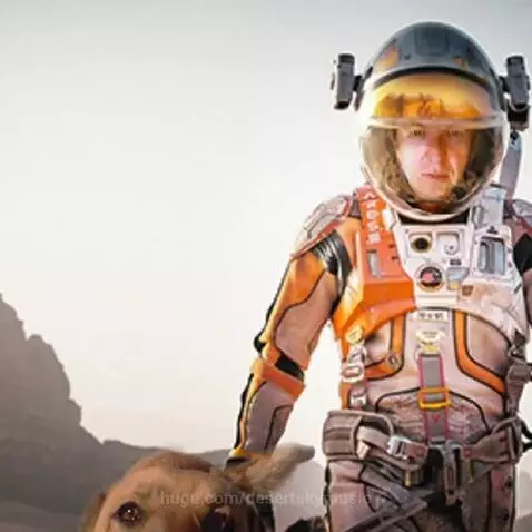 This Guy in a spacesuit walking with his red German Shepard and Akita mixed dog on Mars, Camera around him showing a POV from behind as the space suit clad man and his dog walk forward across the Martian desert, the camera elevates 10 feet and we see in the distance the dome shaped biosphere space station which is their destination