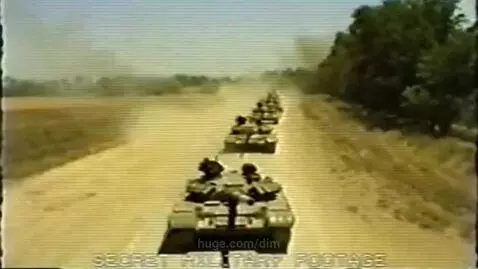 sora 2 Prompt: Cinematic realistic high-detail footage styled as old VHS recording from the 1980s Soviet Union: low resolution, slightly faded yellowish-green colors, soft focus, visible analog noise, horizontal scan lines, slight interferences, and crawling tracking bar at the bottom. A constant small, simple white, slightly blurred and shaky text "SECRET MILITARY FOOTAGE" due to VHS distortions appears at the screen bottom. The atmosphere is eerie amateur recording with an anomalous event. A convoy of old Russian T-72 tanks rumbling down a sun-baked, dusty rural road beside a line of leafy trees, stirring up plumes of dust in the scorching summer daylight. Medium shot, bird's-eye view.