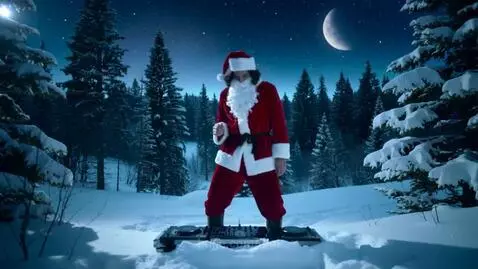Kling 2.5 Turbo (pro) Prompt: Cinematic realistic film photography, a 30-year-old Santa Claus in an unbuttoned coat, no hat, with messy dark hair, short sides, standing before a snowdrift with a DJ controller. He sports a stubble turning silver at the edges. Playing deep house and dancing. Full-height portrayal on a snowy glade in a dense winter forest. It's night, clear starlit sky. High detail, professional lighting. Full body shot.