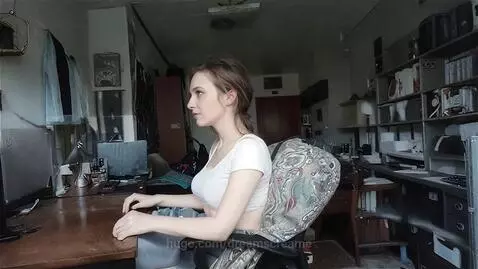 A pretty 25-year-old young adult woman with a beautiful physique and a gentle pleasant voice is very indignant that her computer was sold without her knowledge, she points to an empty table and gently hits it with her fist.