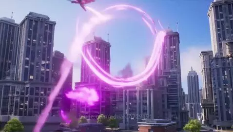 suddenly a pink portal opens in gray blue futuristic city. Later on, a giant pink ship comes from a portal and starts shooting lasers to destroy buildings and make thousands of pink explosions