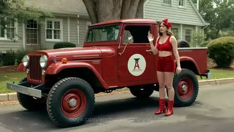 Google street view 1749 Waldorm Grand Rapids, MI 49505-7607 United States beautiful red head crop top and bootie shorts beckons inside red 1959 jeep cj5 parked in driveway with big tires