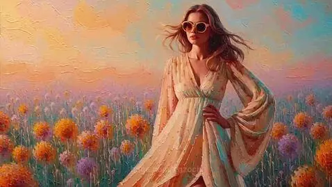 sora 2 Prompt: A highly detailed oil painting of a stylish woman wearing elegant sunglasses and a flowing bohemian dress, standing confidently in a dreamy setting. Her expression is calm and artistic, with soft brush strokes defining her face and outfit. The background is filled with abstract wildflowers painted in expressive, vibrant colors, creating a poetic and modern contrast. Rich oil paint texture, visible brush strokes, warm color palette, artistic depth, gallery-style fine art, painterly realism with a