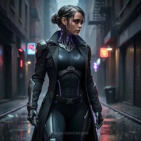She walks forward, adjusting her hair with her hand, LED lights flickering on her neck. Another athletic woman approaches her from the camera's direction.