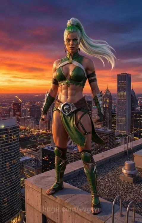 She jumps down and, as she falls, spreads her green wings and flies.