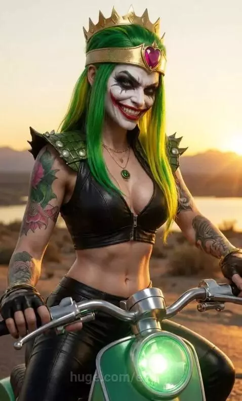 She rides forward on a scooter and laughs.