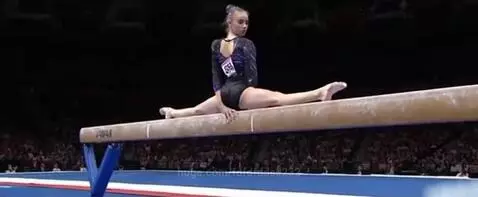 gymnast doing middle splits on balance beam