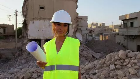 Hunyuan Video Prompt: The scene opens with a confident female civil engineer standing in front of a partially collapsed and damaged building in a dense Middle Eastern urban area — broken walls, exposed rebar, and rubble on the ground. She’s wearing a white safety helmet and a bright neon vest, holding blueprints. The environment reflects a post-conflict or aging neighborhood with nearby buildings, faded walls, and power lines. She looks at the camera and says firmly: “We don’t leave ruins behind. We rebuild them.”