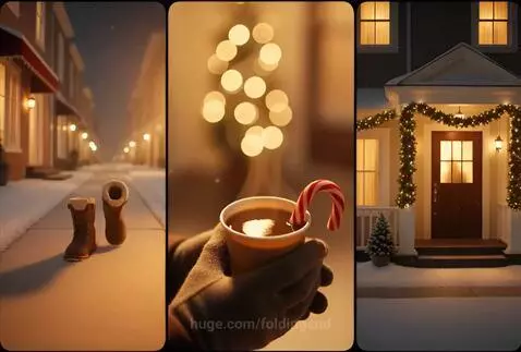 Grok Prompt: A warmly lit three-panel triptych capturing the gentle magic of Christmas evening in a quiet town, filled with comfort, nostalgia, and human warmth. The palette is rich with soft golds, warm reds, evergreen tones, and gentle snowy whites.