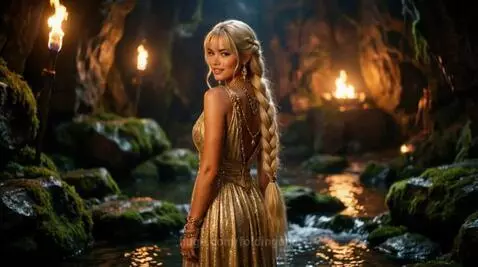Kling Prompt: A glowing torch-lit cavern with a shallow underground river reflecting golden firelight. A beautiful fantasy princess in a shimmering gold gown stands in the water, mist drifting slowly around her legs. Soft magical particles float in the air as her long braided hair gently sways. The camera begins a slow cinematic arc around her shoulders.Deep echoing cave ambience hums quietly, water dripping in the distance, torches crackling softly.At second 4, a massive dragon-shaped shadow slowly stretches across the cavern wall behind her, growing larger and darker as a low mythical roar rumbles through the cave, mixed with deep cinematic bass.The firelight flickers violently, mist rolls faster across the water, and the shadow’s wings slowly spread wide.At second 8, the music swells into epic 80s fantasy synth-orchestra tones as the camera finishes the arc, revealing the full towering shadow looming behind her in a legendary reveal.Sound vibe:
