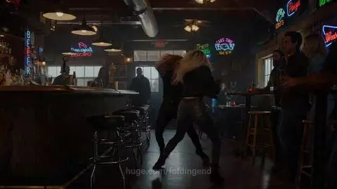 Seedance 2.0 Prompt: [Character A: @ingunn1, athletic build in a dark leather jacket] and [Character B: @jen, shorter with wild curly hair in a torn band t-shirt] face off across a dimly lit dive bar with neon beer signs flickering on wood-paneled walls.