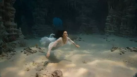 Seedance 2.0 Prompt: A mysterious woman drifts gracefully toward the ocean’s surface, her body suspended in the vast, ethereal depths of an underwater cave. As she ascends, shafts of golden light (God rays) pierce through the water, illuminating the scene with a soft, celestial glow. Tiny bubbles escape from her lips, rising in delicate trails. Her long hair flows weightlessly, caught in the gentle underwater current.Midway through her ascent, a breathtaking transformation begins—her legs subtly shimmer, dissolving into an elegant mermaid