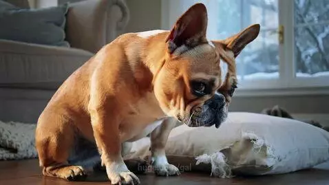 Short cozy video. French Bulldog looks guilty with destroyed pillow, then gets petted, then plays happily with a ball. Warm lighting, dynamic shots, slow motion close-ups of happy face. 4K, realistic.