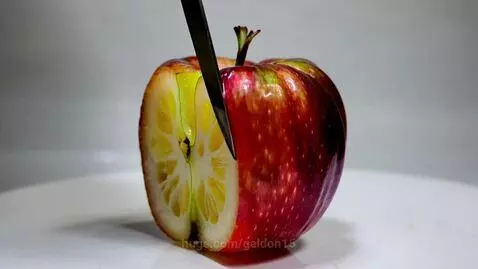ultra close-up of a hyper-realistic glass apple being sliced by a sharp knife, cinematic lighting, slow motion, 120fps, satisfying ASMR style, high detail, clean white background