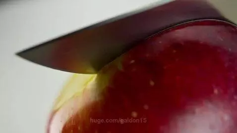 ultra close-up of a hyper-realistic glass apple being sliced by a sharp knife, cinematic lighting, slow motion, 120fps, satisfying ASMR style, high detail, clean white background