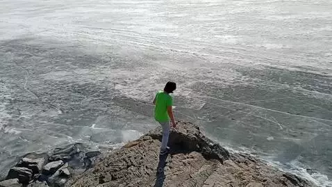 A woman jumps onto the ice, breaks through the ice, dives, and emerges in another ice hole.