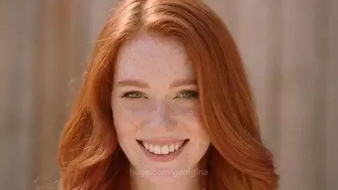 Scottish female redhead centerfold beauty model closeup, then medium shot, then full shot. She smiles and laughs at the camera. She wears cutoff halter top, cutoff jean shorts, heels. Her long Hair is down.