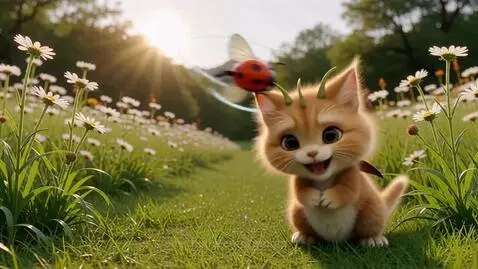 Happy amd excited tiny adorable kitten dragon like creature with puffy fuzzy fur, playing with a ladybug flying around