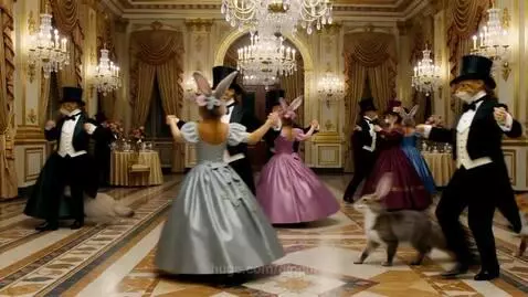 Cats in dapper clothes at a fancy and extravagant party with other animals in amazing clothing and hats dancing.