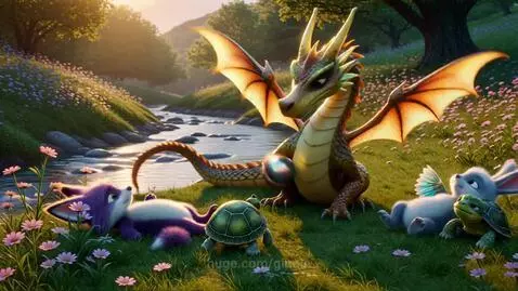 Excited and happy dragon with creature friends playing a game