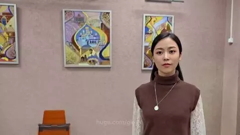 An Asian-looking girl in a long dark skirt and trousers, with long hair tied in a ponytail, walks to the left down the corridor. The camera follows her.