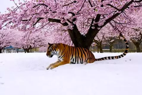 cherry blossoms in the snow with sabre tooth tiger sitting under the cherry blossom tree