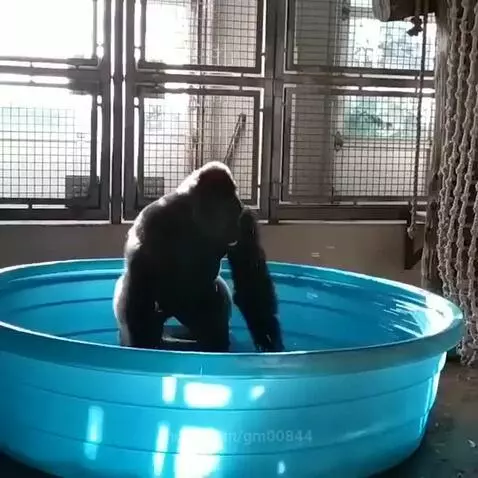 Gorilla splashes around in a kiddy pool