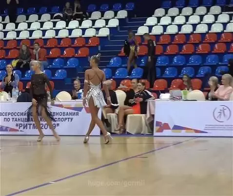 a girl in a silver shiny Latin American short suit, holding the waist and hand of a girl in a black Latin American suit, dances samba with her