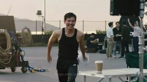 Bloopers with Jackie Chan, he laughs after a failed trick and sips from a paper cup of coffee