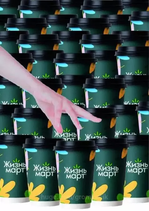 A hand takes away one cup out of the frame. Another hand takes away another cup out of the frame. Then more hands from all around the frame take away all the rest cups from the frame one by one.