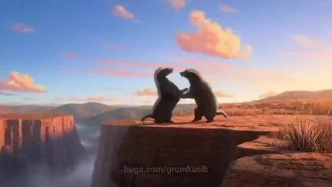 sora 2 Prompt: Fight between two honey badgers on the top of the African mountains. They comically kick with their legs, slapping and slamming, playfully cursing at each other in english. Intense action with dramatic camera angles. Wide shot capturing the stunning landscape. Cinematic hyperrealistic. Subtitles.