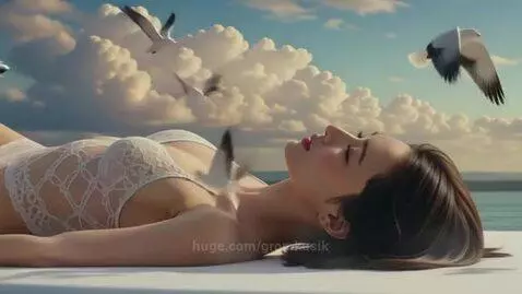An attractive Japan woman in lace lies on her back on the ocean beach. Waves crash against the sandy shore. Birds are flying. The camera pans close-up along her eyes, face and then body. Jazz is playing, sea waves and birds noise.