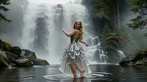 Girl made of crystal dances under the waterfall. Her skin is shining with metal glow. Classic music and sax playing.