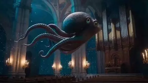 sora 2 Prompt: In a baroque visual style, an octopus floats through the space of a cathedral with an organ, making gurgling sounds mixed with English speech. This can be seen against the background of twinkling stars, accompanied by loud organ music. Medium frame, floating angle.