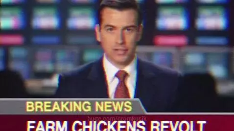 sora 2 Prompt: Film a «news report» about the chicken escape: Anchor (voiceover): «In a shocking turnof events, farm chickens haveoverthrown their captors!» Cut to shaky handheld footage: chickens running, the exploding piemachine, Ginger waving from the plane. Text overlay: «EXCLUSIVE FOOTAGE». aesthetic: VHS glitches, timestamp incorner.